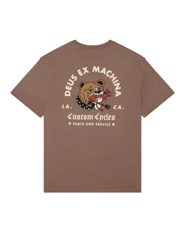 Korte mouwen Deus Ex Machina t-shirt gemaakt van 100% katoen met een print van een een bulldog die de duivel opeet.